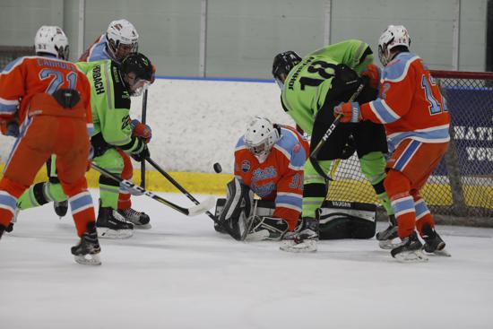 Chaos ensues in front of Little Caesars goaltender Joseph Tynan during Friday's contest. (Photo by Carmo Photography)